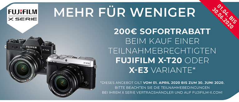 Vom 01.04. bis 30.06.2020 erhalten Käufer einer Fujifilm X-T20 bzw. X-E3 ( Body/Kits ) einen Sofortrabatt in Höhe von 200€ vom regulären Kaufpreis abgezogen. Eine nachträgliche Registrierung ist somit nicht...